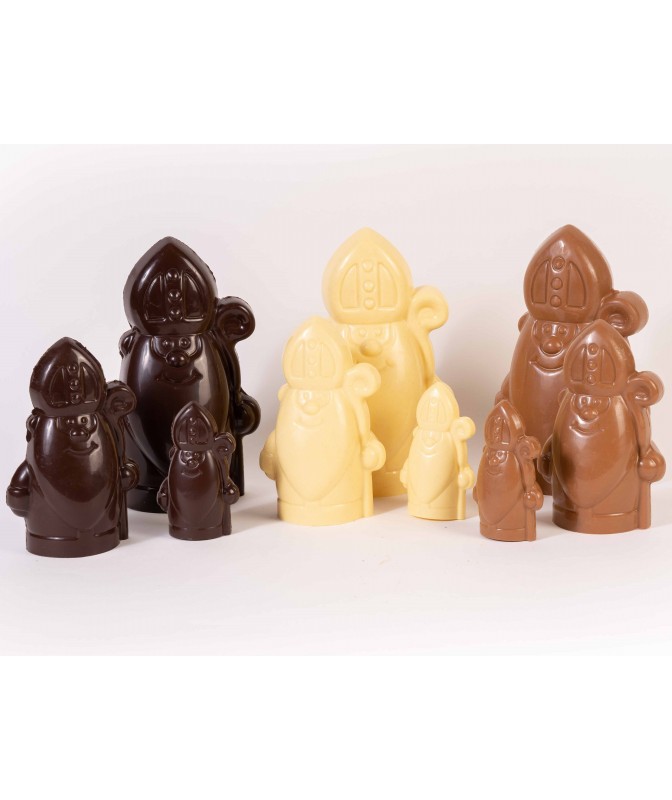 Sujet creux de Saint-Nicolas en chocolat noir, au lait ou blanc.